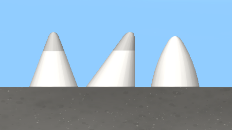 There are two types of nose cones: the triangular nose cone, the sloped nose cone, and the rounded nose cone. Nose cones of all sizes act identically but the types act differently because the sloped nose cone has slightly worse aerodynamics than the triangular nose cone, and the rounded cone has even worse aerodynamics than the other two.