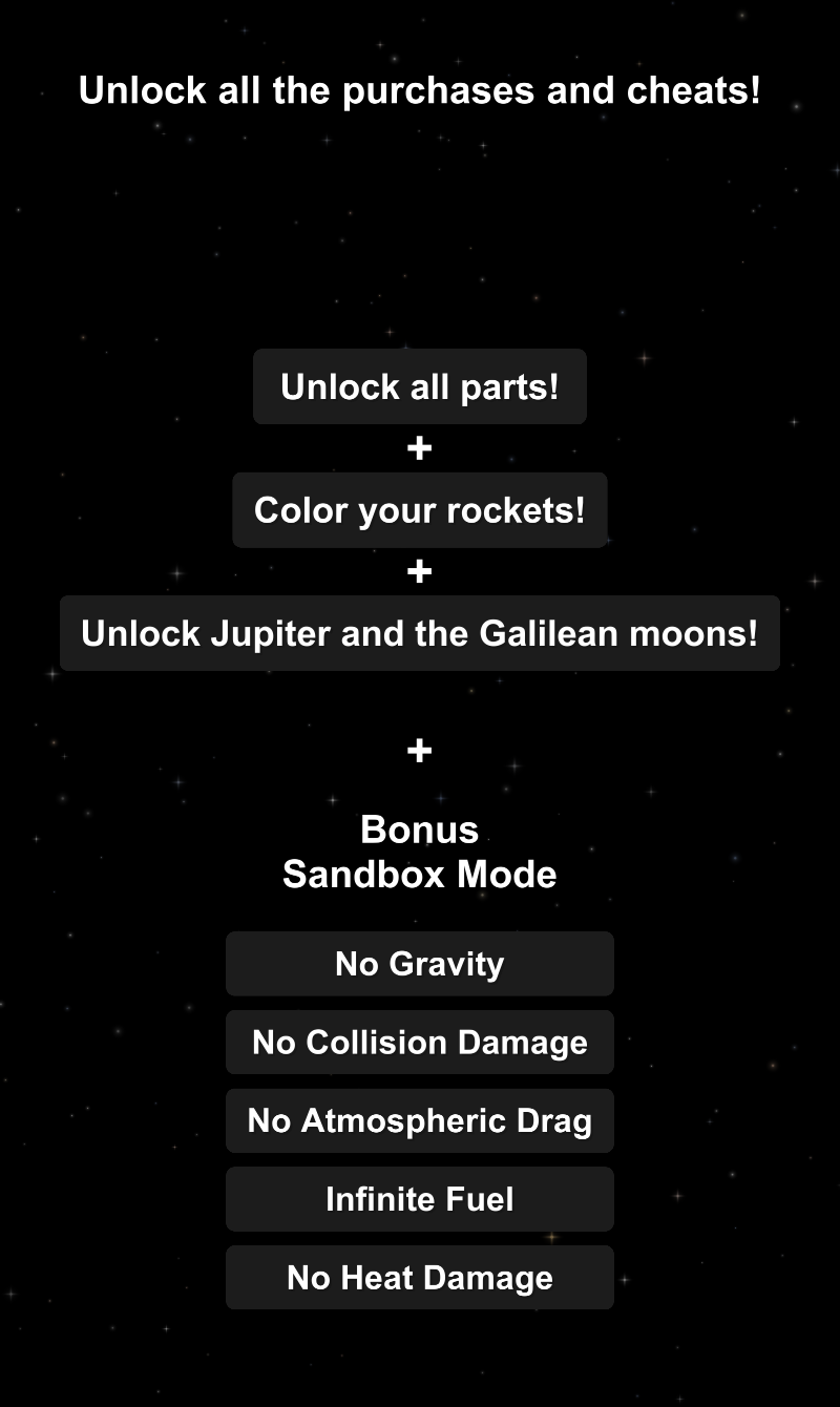 Formerly named Unbreakable Parts, this cheat would make your rockets invincible. This can be used if you want to dock something on the surface, while not destroying parts in the process, and trying to push another rocket without destroying it.